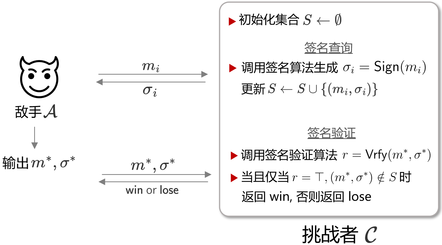 若最后敌手输出的 m∗ 未曾被查询过,且 σ∗ 能通过验证,就可认为敌手挑战成功。这一结果即为“签名的伪造”,此处敌手的优势可写为: