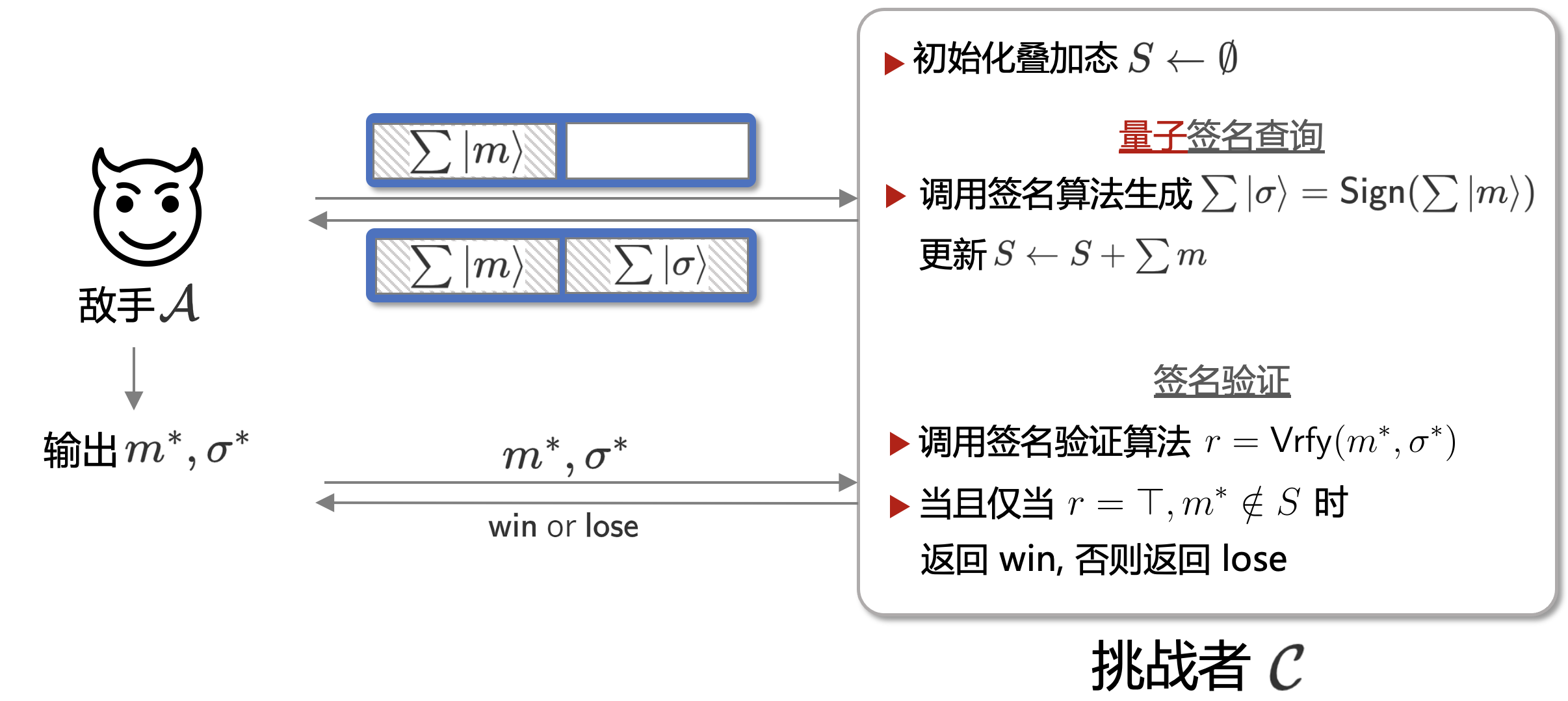 而对于量子签名查询, 和加密类似, 核心的框架依然没变, 只是套用了量子查询这种形式下。这一Game的示意图如下所示: